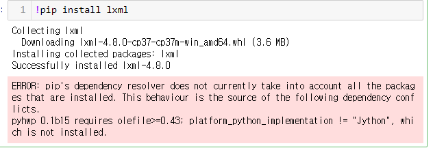 3. pip install lxml 명령어를 입력한다.