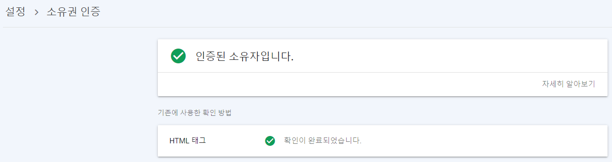4. 설정> 소유권 인증 페이지에서도 인증된 소유자임을 확인할 수 있다.