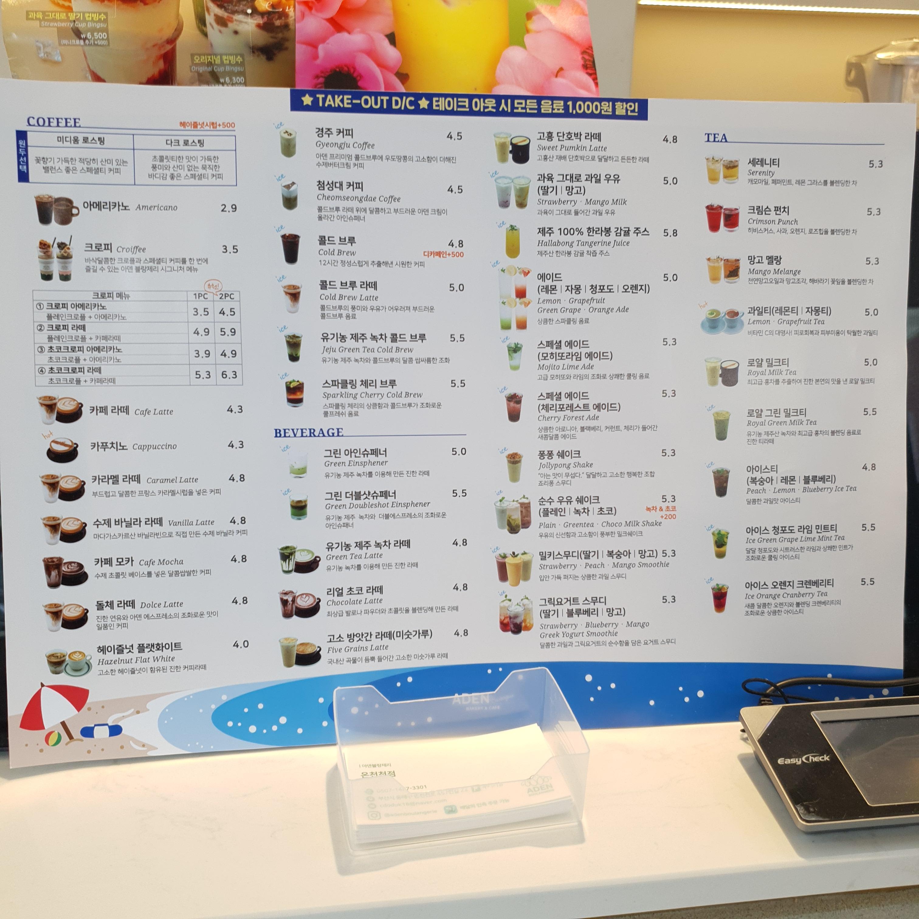 아덴블랑제리 메뉴판을 보면
