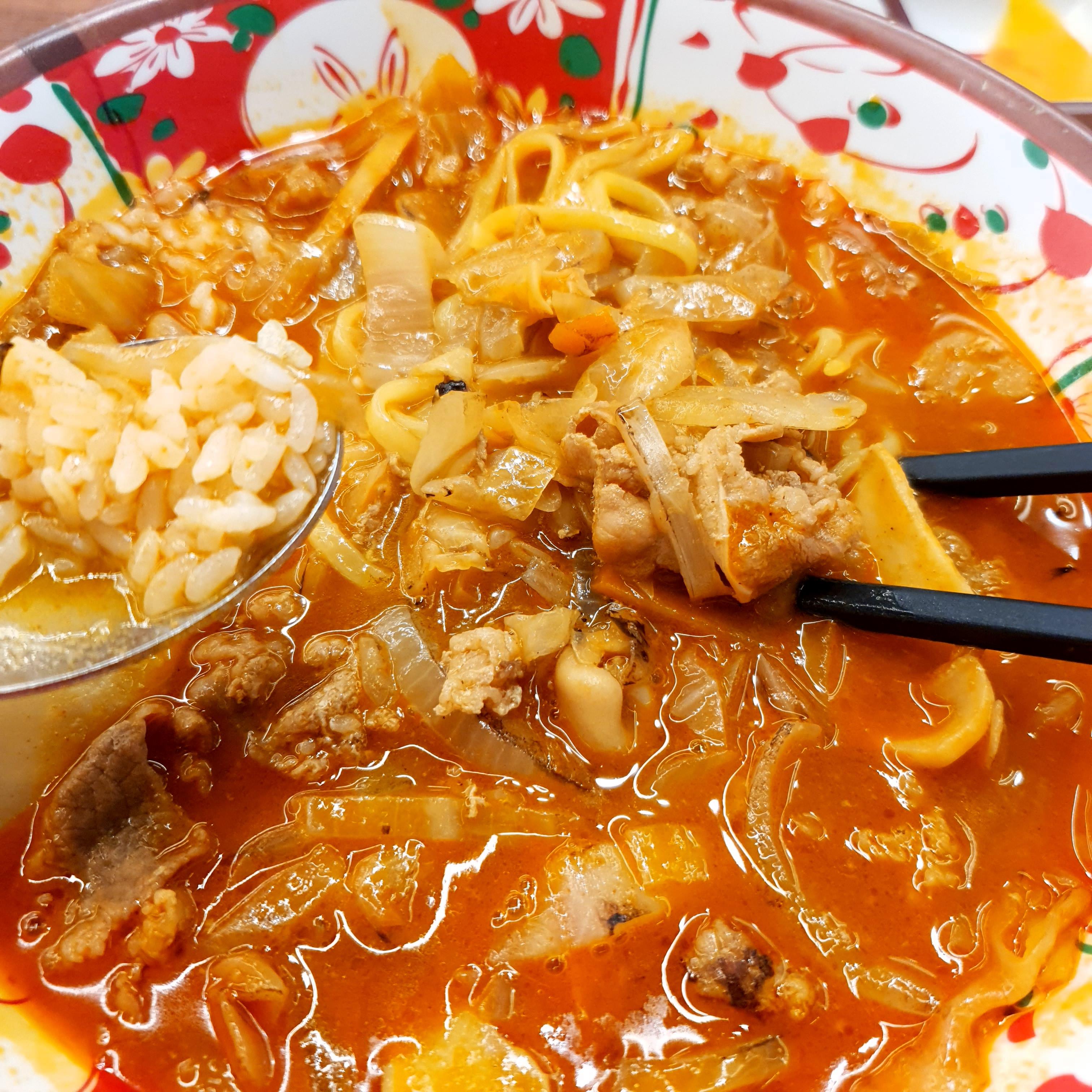 짬뽕에 밥을 조금 말아서 소고기와 야채와