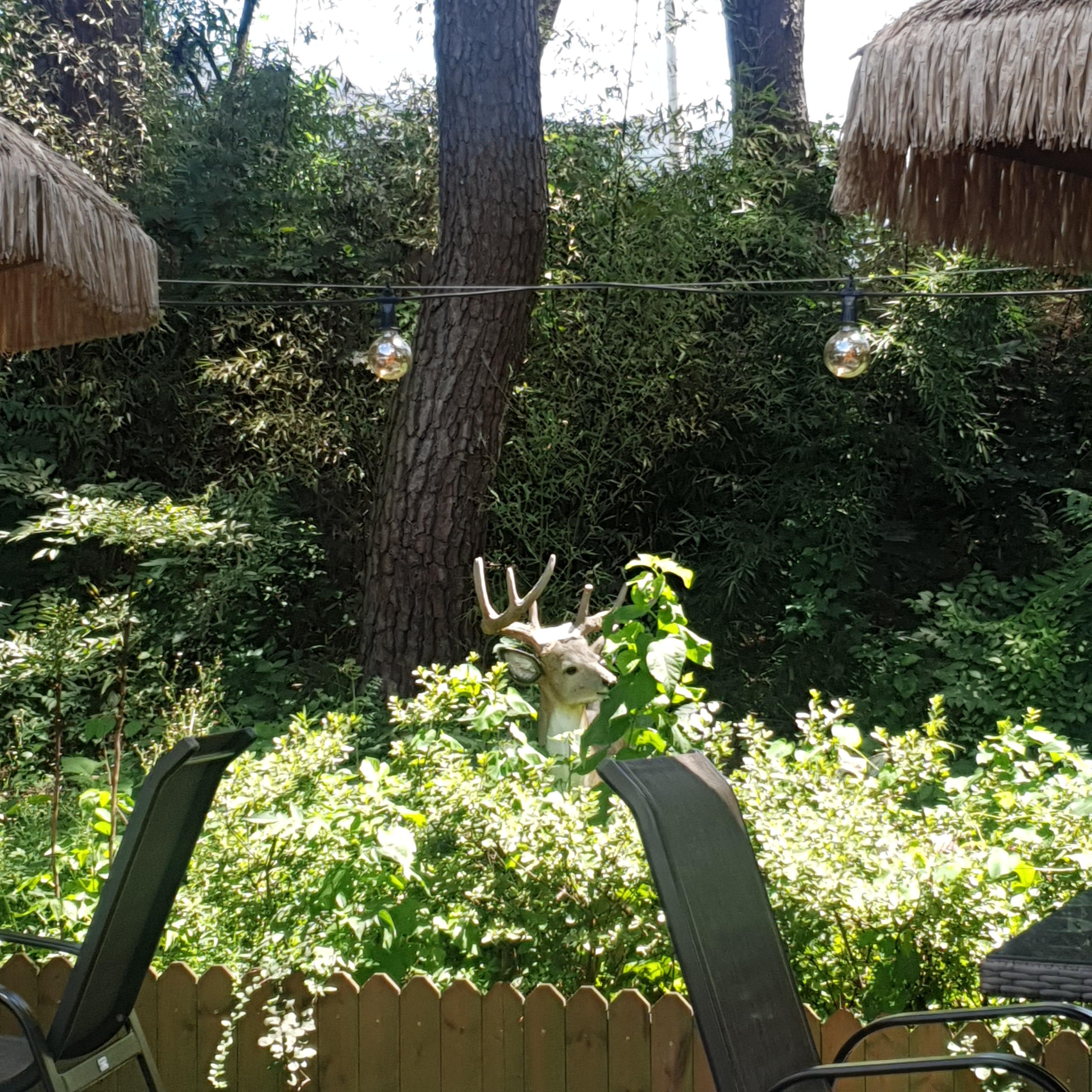 수풀 속에 사슴 모양 조각상이 하나