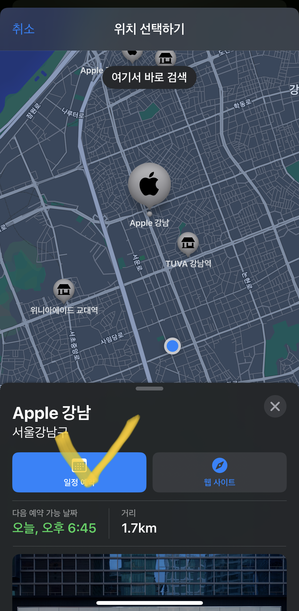 수리받을 제품 가져가기의 '위치 보기'->가까운 매장인 애플 강남 선택-> 일정 예약 버튼이 뜬다.