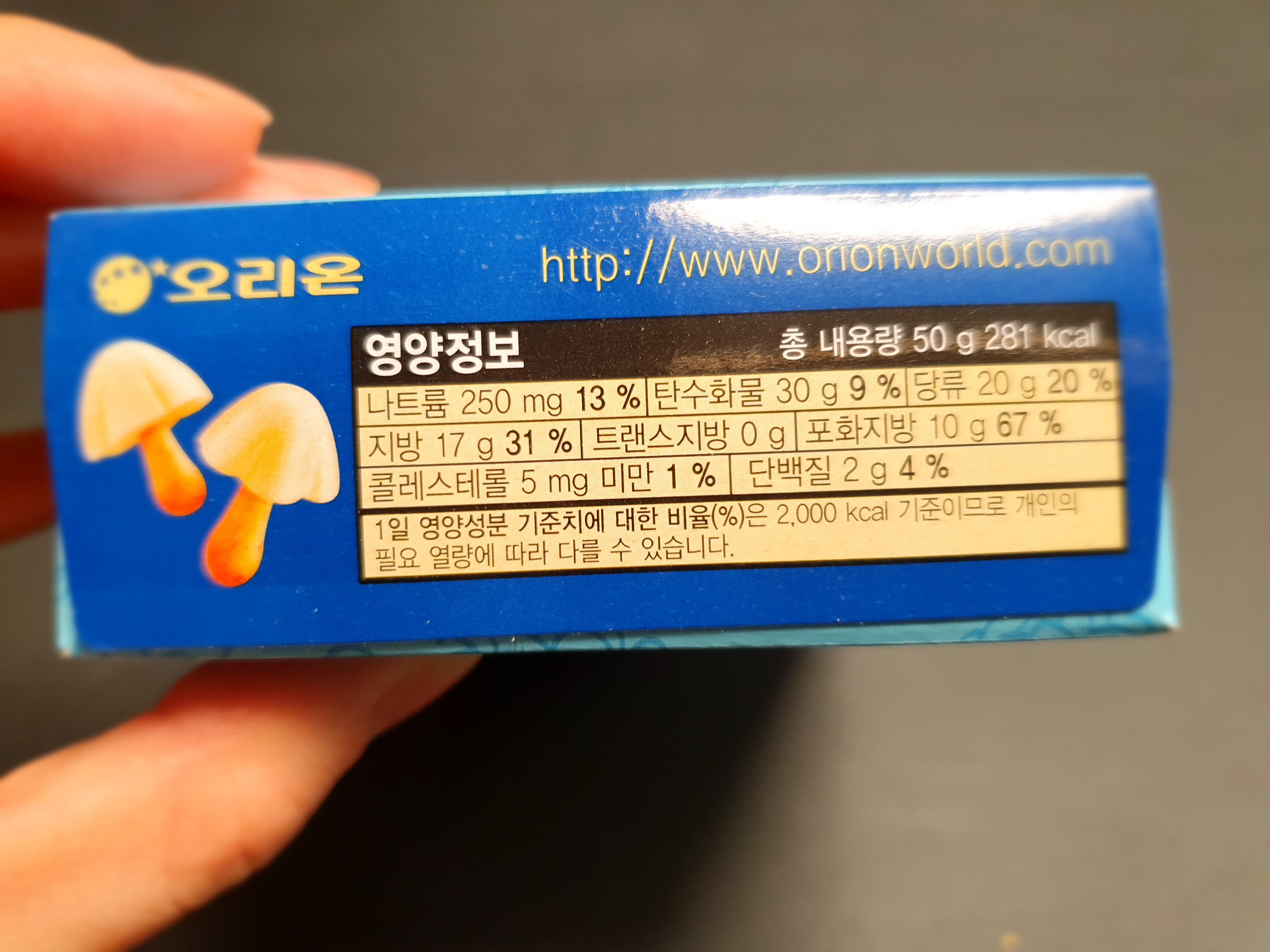 오리온 하양송이 칼로리는 281kcal,